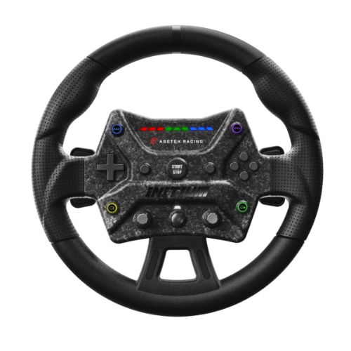 The Asetek Initium Steering Wheel (PC) is a 300 mm round sim racing wheel. It features 21 programmable inputs, including 11 push buttons, a 4-way D-pad, two rotary encoders, and two magnetic shifter paddles. The wheel incorporates four backlit buttons and nine customizable aRGB rev‑light LEDs to provide visual feedback. It uses a cable-free quick‑release system that integrates USB and power through the hub for cleaner setups. You can adjust inputs and lighting via RaceHub software and deactivate torque instantly with the central Start/Stop button.